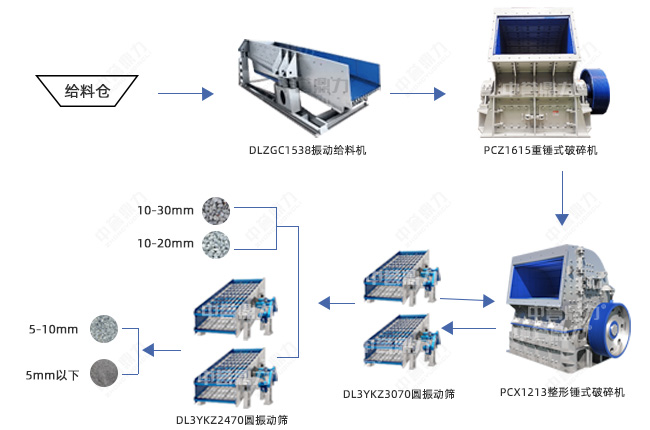 設備配置:DLZGC1538振動給料機、DLPCZ1615重型錘式破碎機、DLPCX1213整形錘式破碎機、2臺DLYKZ3070圓振動篩、2臺DL3YK2470圓振動篩、輸送帶