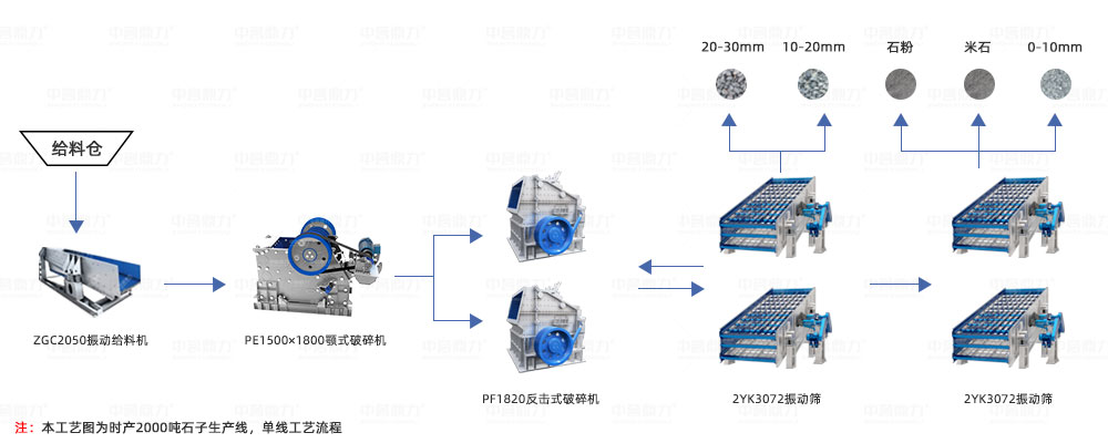 主要設備配置:DLZGC2050振動給料機2臺+PE1500×1800顎式破碎機2臺+PF1820反擊破4臺+2YK3070振動篩8臺