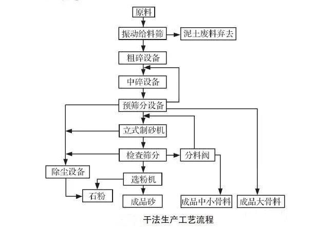 中北方干旱、少雨,水資源缺乏,在這種自然條件下,優(yōu)先采用干法工藝生產砂石骨料。干式制砂法自開始推廣普及以來,通過設計院、設備廠家和用戶各方技術人員的不斷努力,困擾干法生產的泥土、風化巖、石粉含量過高以及生產時粉塵污染問題已經初步得到了解決,已經成為目前大型骨料生產線選生產工藝。目前有塔樓式干法制砂生產線和平面式制砂生產線兩種。