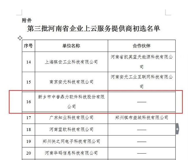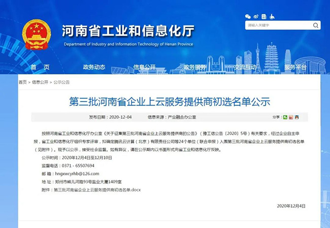 為貫徹落實《河南省智能制造和工業互聯網發展三年行動計劃(2018—2020年)》(豫政〔2018〕14號),完善企業云服務生態體系,加快省企業上云上平臺步伐,按照《河南省企業上云三年行動計劃(2018-2020年)》(豫工信產融〔2018〕92號)和2020年河南工信廳有關工作安排,今年10月,省工信廳公開征集第三批河南省企業上云服務提供商。經自主申報、評審和網上公示,中譽鼎力軟件科技股份有限公司初步入選云服務商名單。