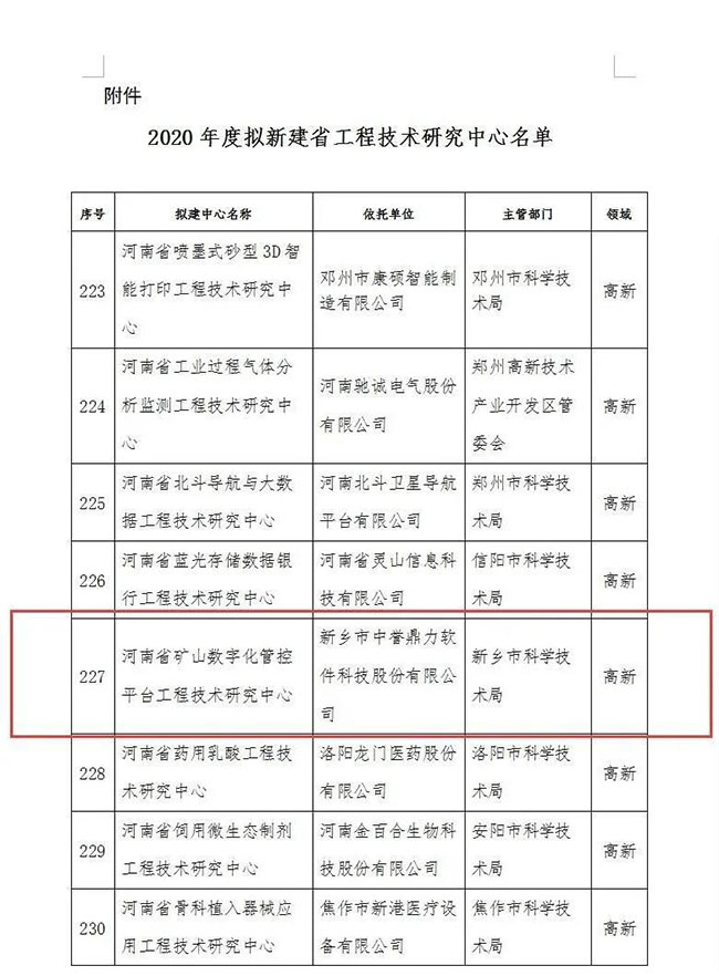 依托新鄉市中譽鼎力軟件科技股份有限公司建設的河南省礦山數字化管控平臺工程技術研究入選擬新建省工程技術研究名單,并順利通過公示。