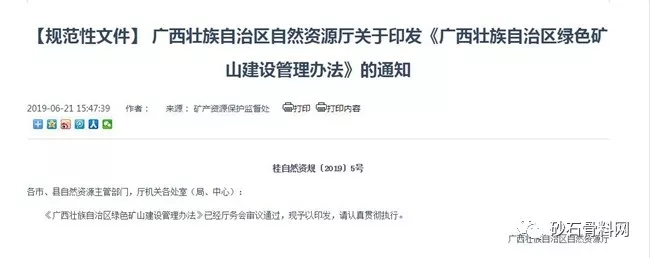 2019年6月17日,廣西壯族自治區(qū)自然資源廳印發(fā)《廣西壯族自治區(qū)綠色礦山建設(shè)管理辦法》(簡(jiǎn)稱《辦法》),這意味著廣西綠色砂石礦山建設(shè)有了詳細(xì)的考核。以下內(nèi)容整理由砂石骨料網(wǎng)整理。