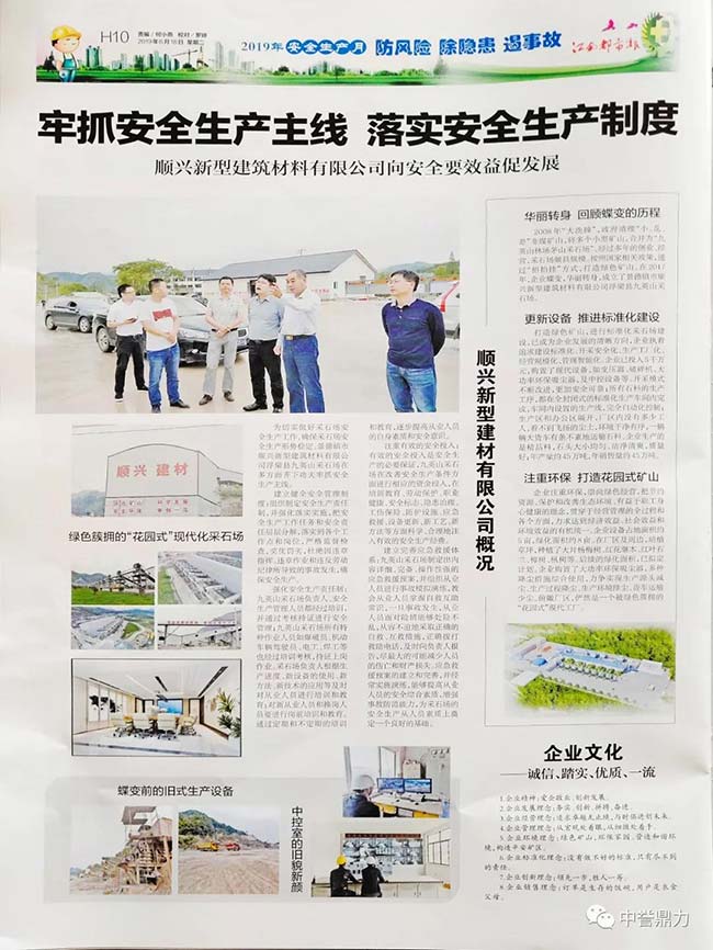 近日,中譽鼎力EPC承建的江西省景德鎮市順興建筑材料有限公司九英山采石場骨料生產項目因安生產工作突出,被當地媒體登報予以宣傳!