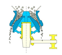 圓錐式破碎機(jī)(圓錐破碎機(jī))工作時(shí),電動(dòng)機(jī)的旋轉(zhuǎn)通過皮帶輪或聯(lián)軸器、傳動(dòng)軸和圓錐部在偏心套的迫動(dòng)下繞一固定作旋擺運(yùn)動(dòng),從而使圓錐破碎機(jī)的破碎壁時(shí)而靠近又時(shí)而離開固裝在調(diào)整套上的軋白壁表面,使礦石在破碎腔內(nèi)不斷受到?jīng)_擊,擠壓和彎曲作用而實(shí)現(xiàn)礦石的破碎。
