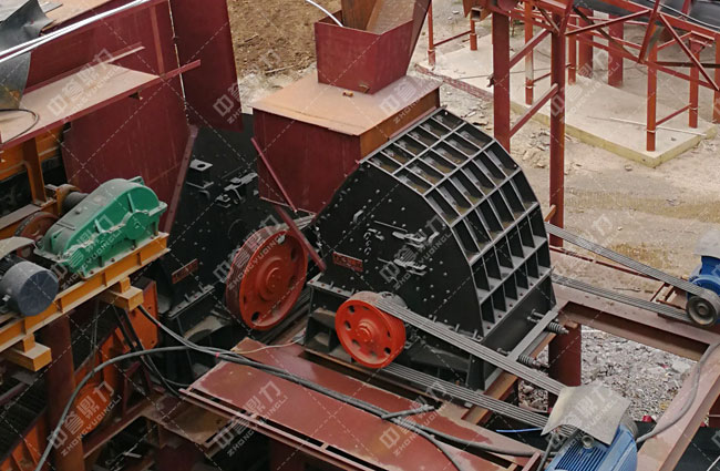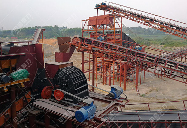 石料由ZGC2038振動(dòng)給料機(jī)均勻地送到頭破(PCZ1815重型錘式反擊破碎機(jī))進(jìn)行粗破,粗破后的物料由膠帶輸送機(jī)送入到二破(XPC1216錘式破碎機(jī))進(jìn)行細(xì)碎,細(xì)碎后的物料被輸送到兩道并篩中進(jìn)行篩分,篩分出五種不同規(guī)格的成品料,由輸送帶送到成品料堆。成品粒度可按用戶的需求進(jìn)行組合和分級(jí)。